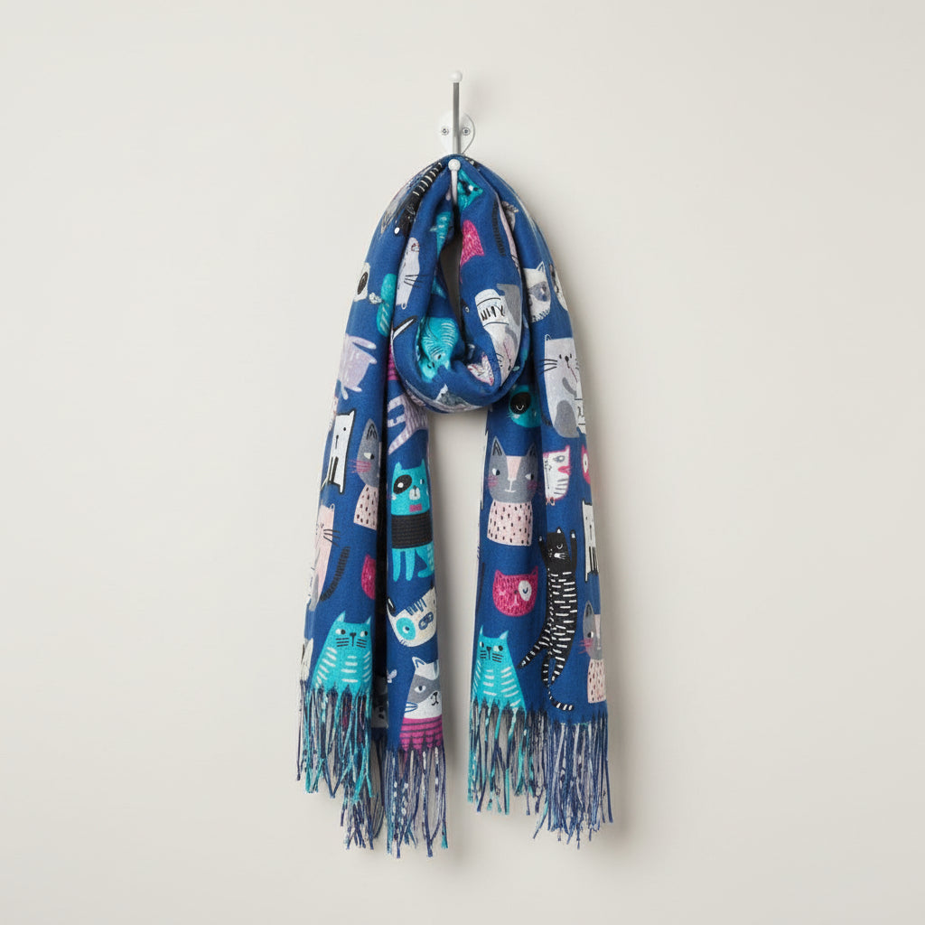 Wrap up in this charming scarf, featuring a delightful collection of playful felines.