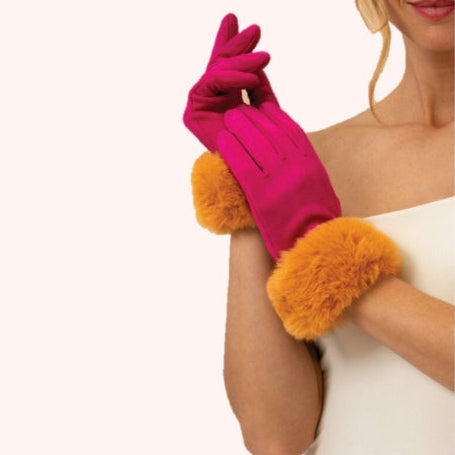 The perfect jewel toned colour combination has arrived! These beautiful Bettina gloves in burgundy and tangerine are perfect for the fashionista in your life. The faux fur cuff adds an extra glamourous vibe to every outfit.