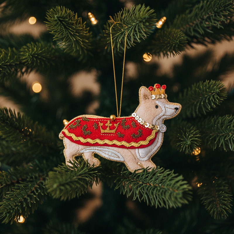 Add some festive cheer to your tree this season with this dazzling embroidered corgi decoration!