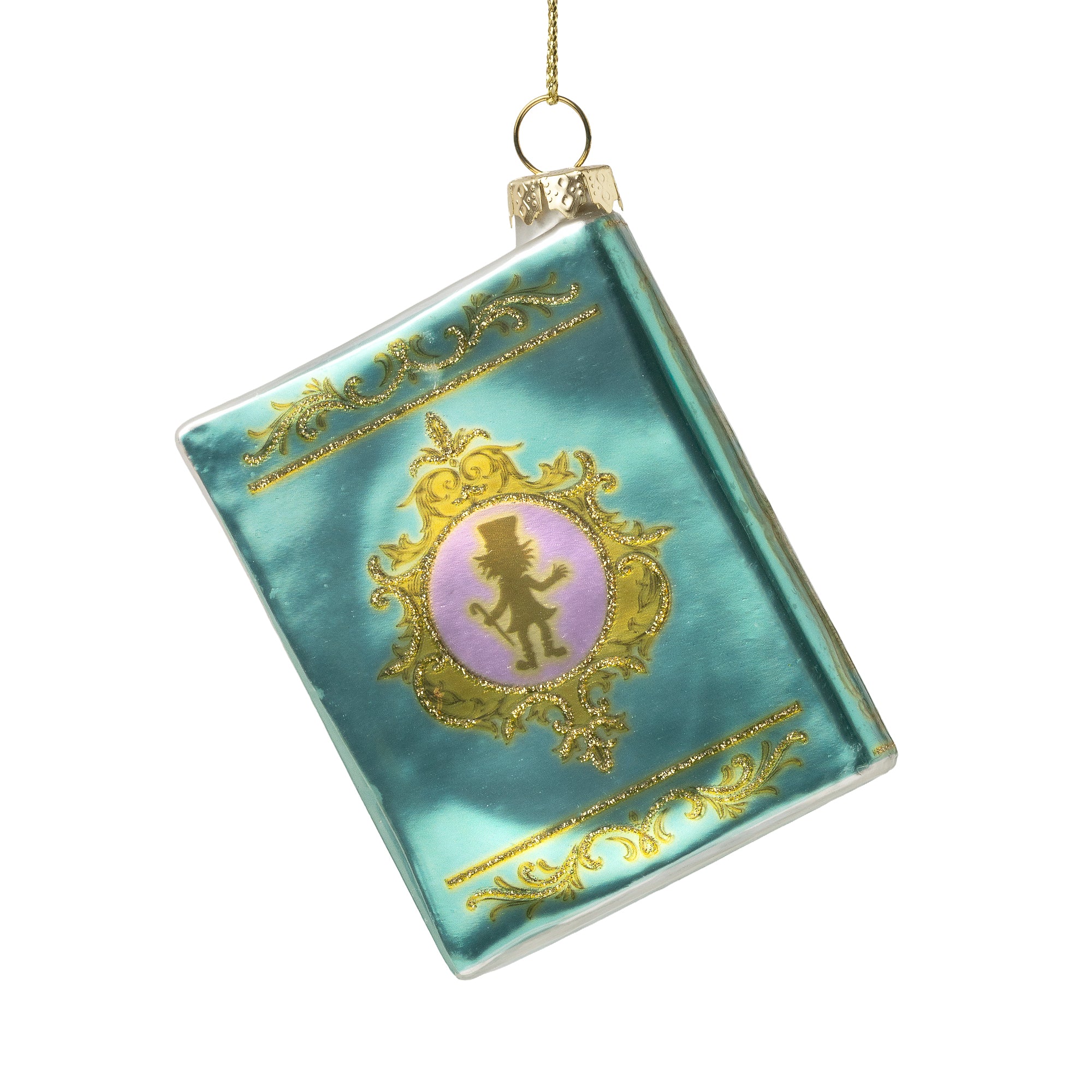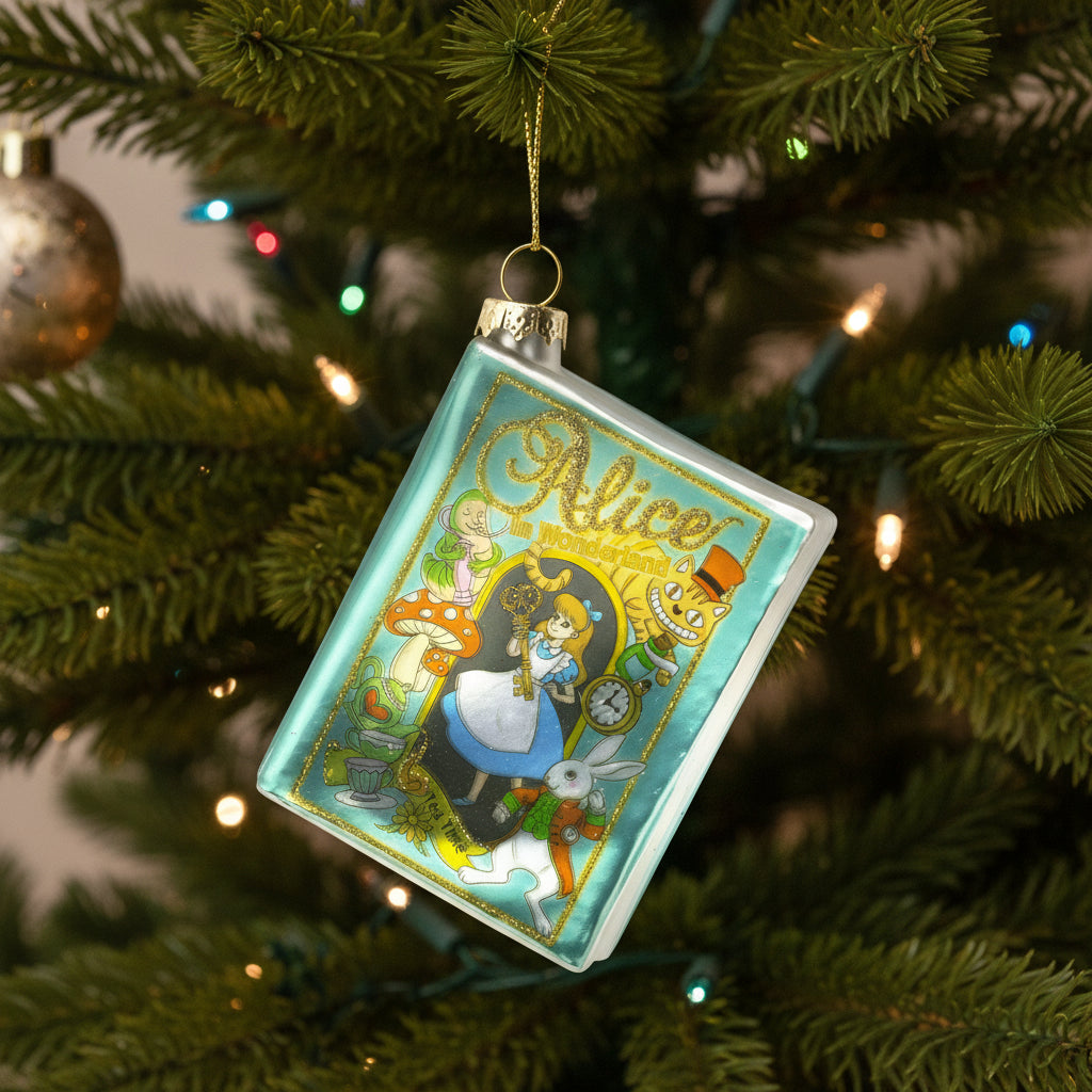 Add some fairy tale joy to your Christmas tree with this Alice in Wonderland Glass Book Decoration featuring glitter details.