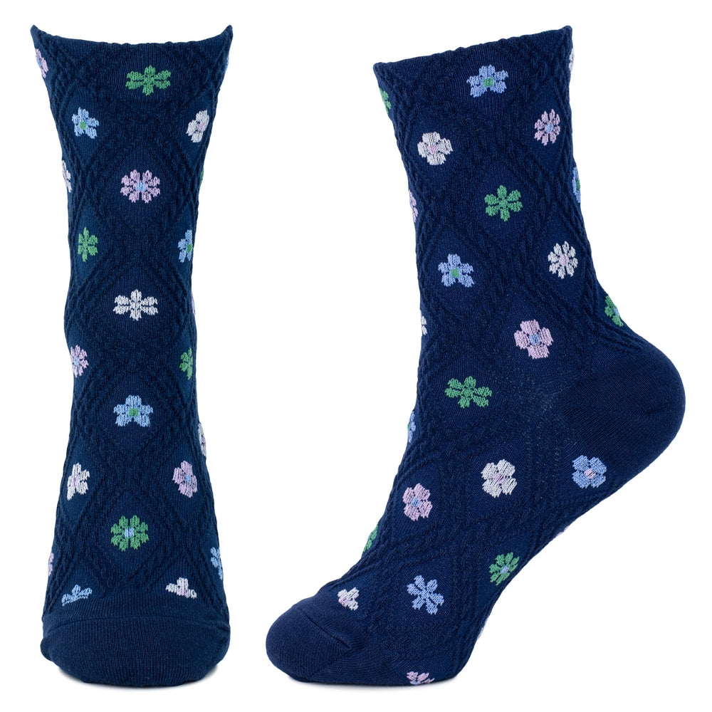 Add a stylish twist to your sock game with these unique embossed texture ankle socks in a navy with a lovely floral repeat - perfect for any outfit!