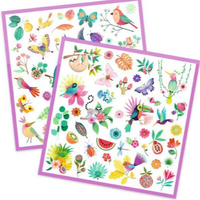 A set of 160 “exotic” stickers. Parrots, sloths, flowers, tropical fruits, etc.